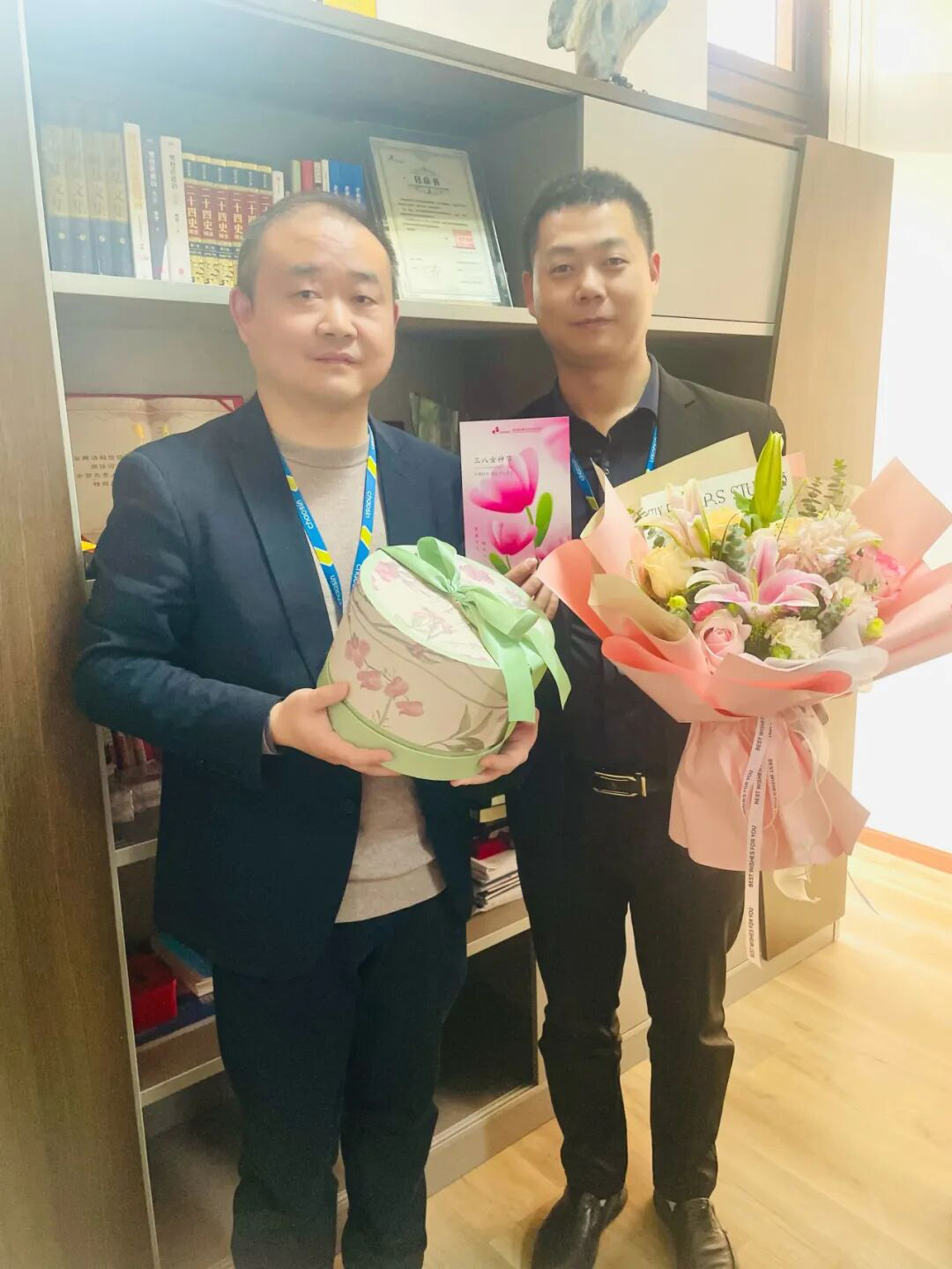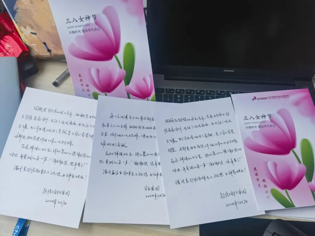手寫紙書作鴻雁,化作春風(fēng)贈祝福。超信國際集團(tuán)領(lǐng)導(dǎo)親自手寫祝福賀卡,每一個字都用心斟酌,每一句話都精心表述,每一份祝福都贈與卡片主人獨(dú)有的詩意,每一份鮮花都贈與她們最美的浪漫,每一份禮物都代表集團(tuán)對她們暖心的牽掛!